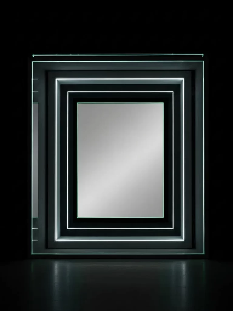 The Neon Box Tunnel Mirror is a deeply architectural, futuristic piece that uses layering and integrated colored lighting to create a perception of infinite depth. It is a square mirror framed by multiple concentric black borders, each one slightly set back from the one before it, creating a three dimensional “box” effect.