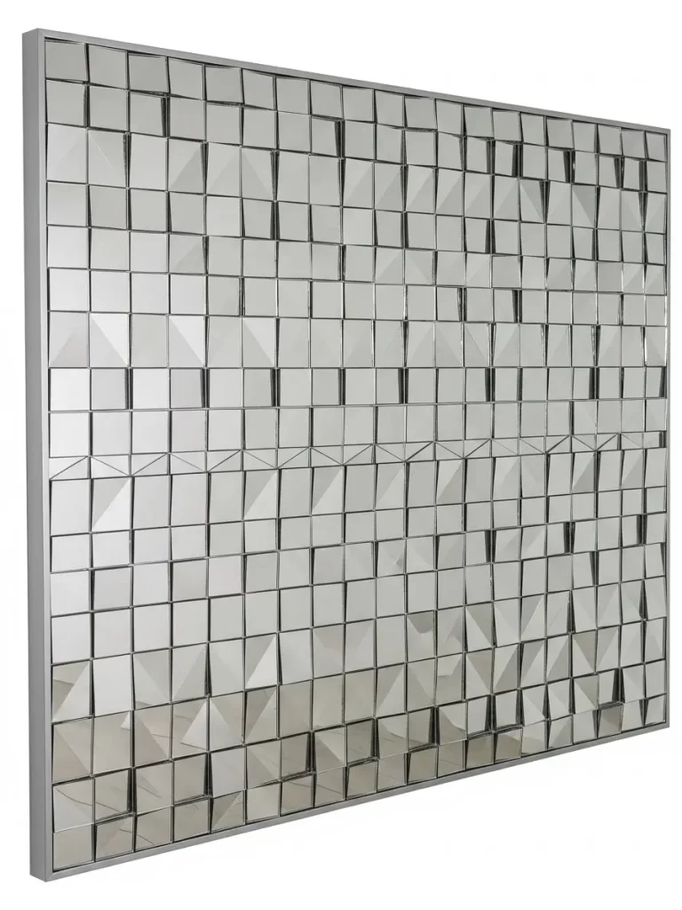 The result is a surface that is both flat and three dimensional, reflecting the room but breaking the image into hundreds of small, angular pieces. The frame itself is a simple, slim silver or aluminum, keeping the focus entirely on the complex reflective surface.