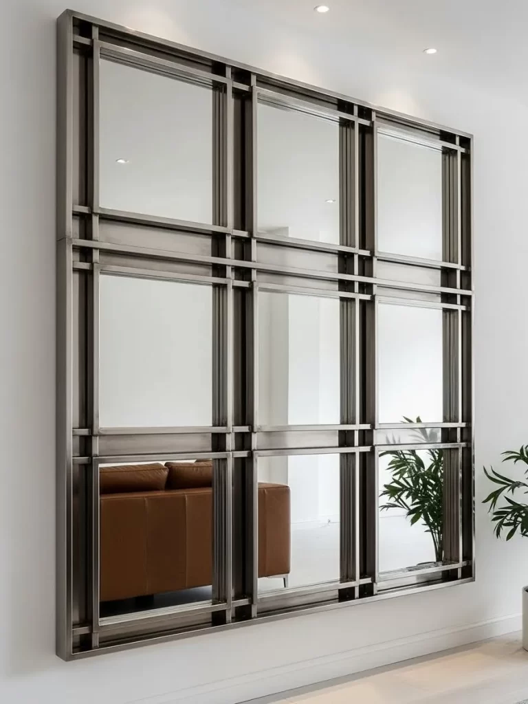 Placed directly across from a piece of striking furniture, like the leather sofa seen in the reflection, it doubles the aesthetic impact of the room’s design elements. It’s a grand scale piece that delivers both maximum light amplification and a powerful, modern structural element. The repetitive square pattern brings a strong, grounded symmetry to any large wall.