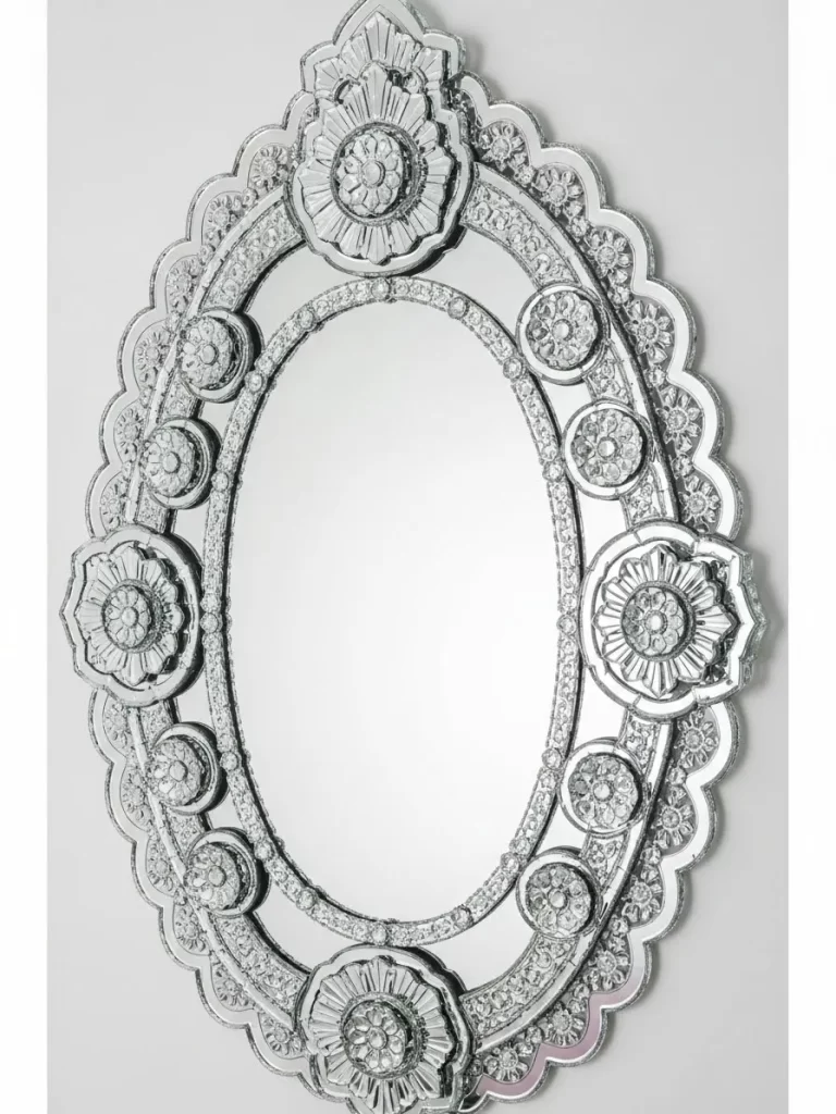 The Ornate Florentine Floral Mirror is a classic, lavish piece defined by its dazzling, all mirrored surface and intricate detailing. The central oval reflection is surrounded by multiple concentric bands of highly decorative, carved mirror work. The entire frame is composed of small, faceted mirror pieces that are shaped into stylized flowers, scrolling patterns, and scallop edges.