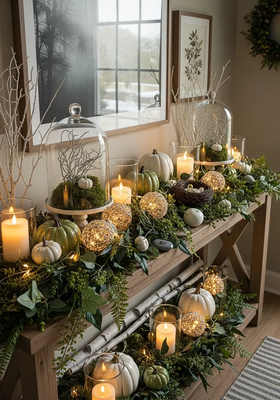 Glass cloches, some housing delicate bare branches on mossy bases and others holding glowing fairy lights, serve as captivating focal points. These illuminated elements cast a soft, ethereal light across the entire scene. An assortment of pumpkins in creamy white and soft sage green are nestled within the greenery, subtly signaling the autumn harvest.