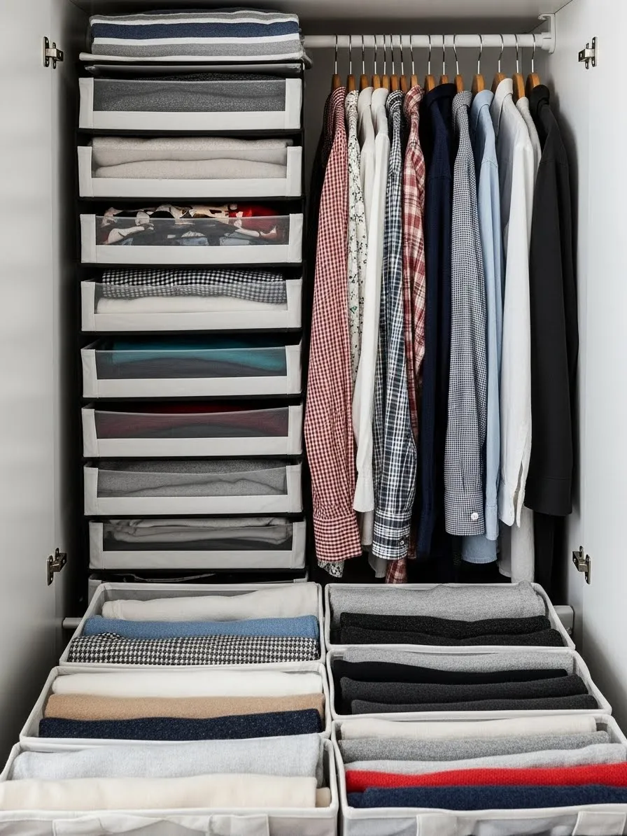 Shelves can become messy with stacks of clothes. The image illustrates a hanging fabric organizer with drawer compartments suspended from the closet rod. Each “drawer” holds folded items like shirts or sweaters, keeping them neat and contained.