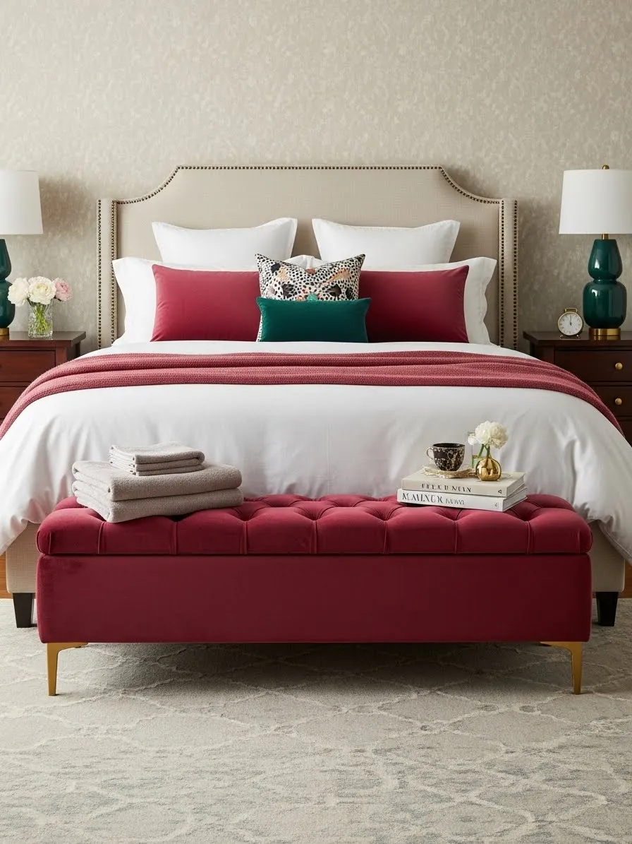 The height and volume created by the bed skirt ground the entire bed, making it feel like a majestic centerpiece. The look is balanced by the crisp white and black pillows on top, preventing the red from becoming overwhelming. Mirroring the bedside table and showcasing a velvet jewelry box below emphasizes the luxurious, celebratory nature of the scene.