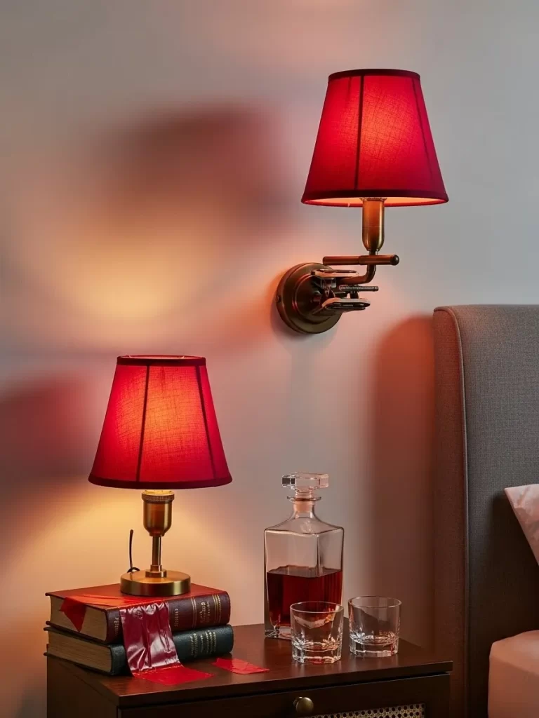 Notice the clever placement of the two different light styles: a small table lamp anchored by a stack of vintage books and a swing-arm sconce mounted directly to the wall. This combination offers layered light sources, preventing any dark corners and allowing you to adjust the intensity as needed. Changing out your current white or beige lamp shades for a rich red hue is perhaps the fastest way to inject romance into the environment.