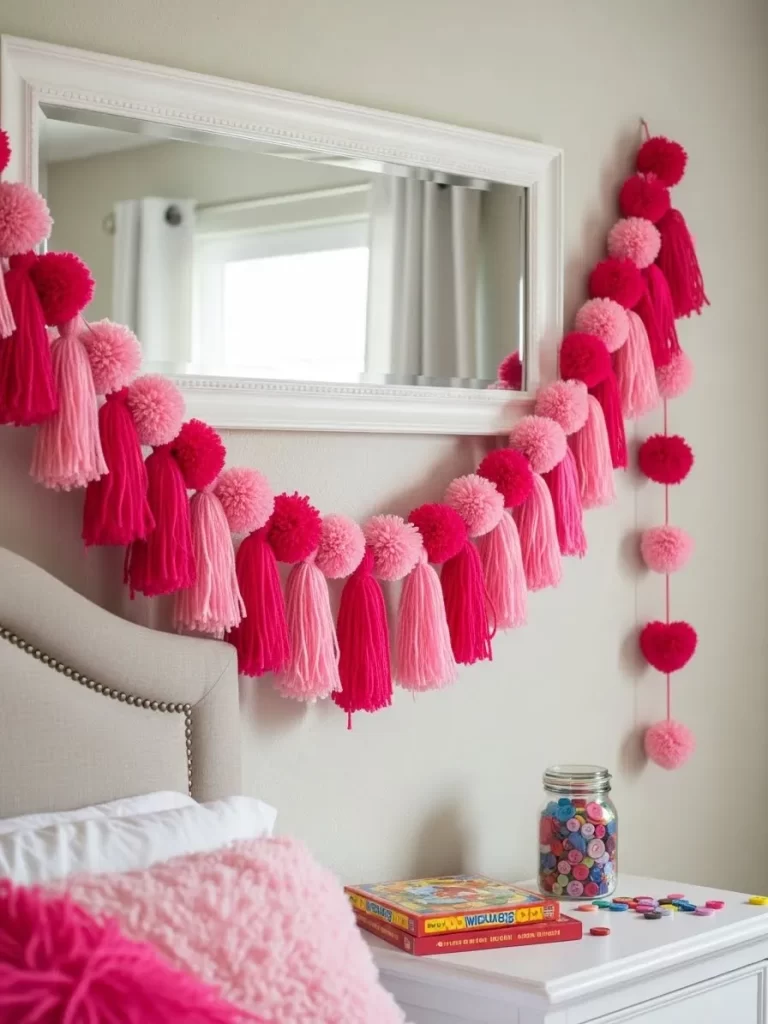 This decorating technique is especially appealing because it uses easily removable materials, leaving no damage to the walls once Valentine’s Day passes. The luminous “LOVE” sign on the bedside table provides a warm, concentrated glow that acts as a secondary light source and a charming message. Finishing the scene with a jar of pink candies ensures the theme is carried through with playful charm.