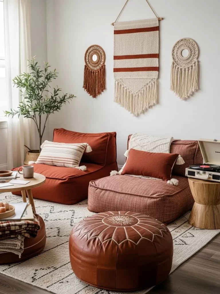 The intense pop of color is beautifully set off by the simple white rug and the natural textures of the nearby hanging chair and plant. This piece invites relaxation and warmth, making an unused corner of the room functional and incredibly inviting. The size and brightness ensure it becomes a fun, lively statement piece.