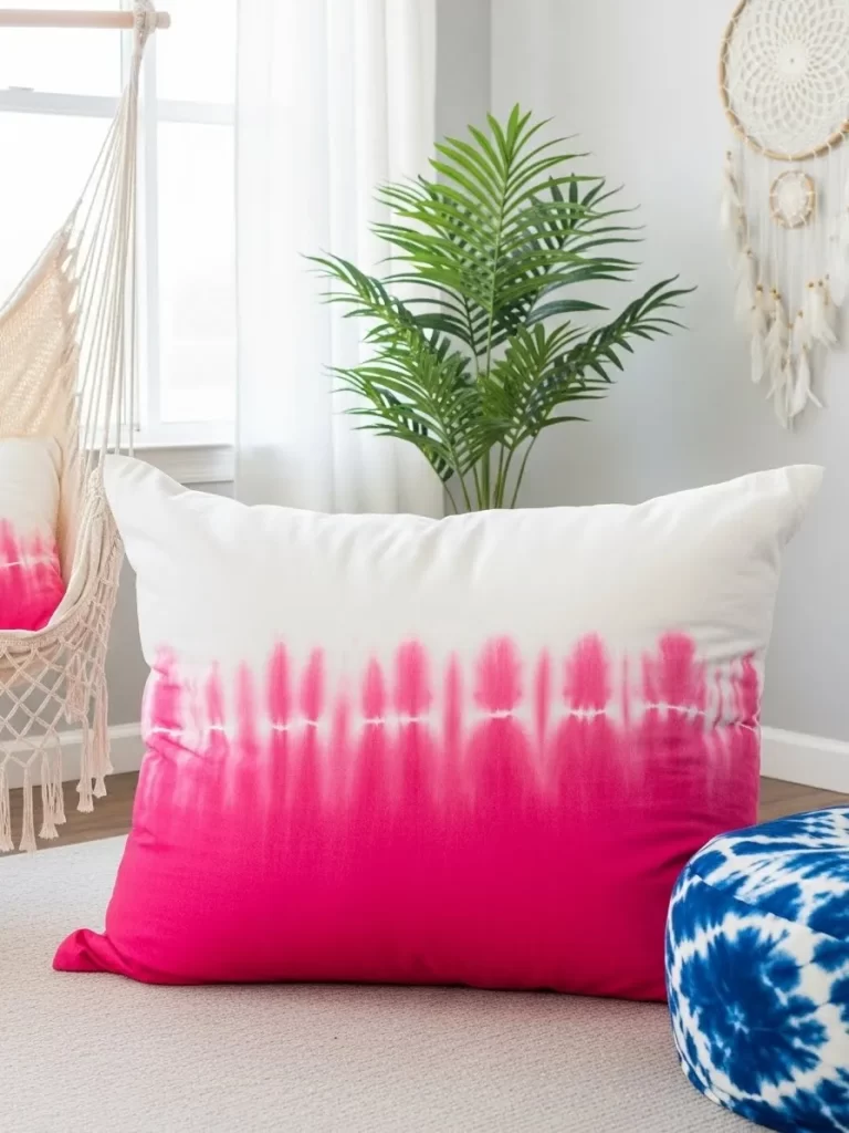 Floor cushions are the ultimate romantic accessory, encouraging comfortable, casual lounging on the floor, perfect for board games or reading together. This oversized pillow features a striking ombré tie-dye effect, fading dramatically from hot magenta pink up to crisp white. The technique adds a modern, artistic flair that instantly catches the eye.