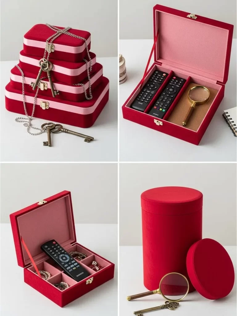 The boxes are designed with internal compartments, making them especially useful for organizing remotes, jewelry, or private keepsakes. They are styled with vintage keys and a magnifying glass, suggesting hidden treasures and secrets. This is a wonderfully elegant and non-traditional way to introduce strong red color and necessary organization.