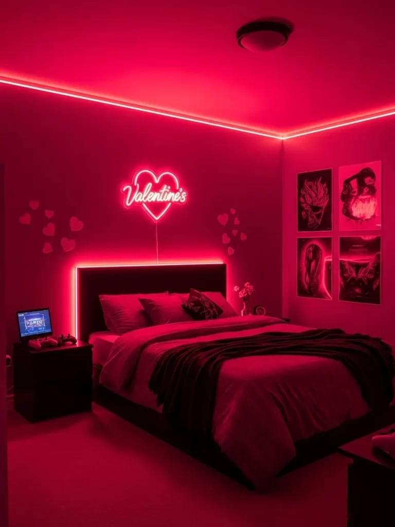For a modern, high-impact romantic transformation, embracing custom neon and LED strip lighting is a dynamic choice. The overhead LED strip lighting, installed around the ceiling perimeter, casts a powerful, saturated red glow over the entire room, instantly changing the mood. The custom “Valentine’s” neon sign provides a fun, focused centerpiece over the headboard.