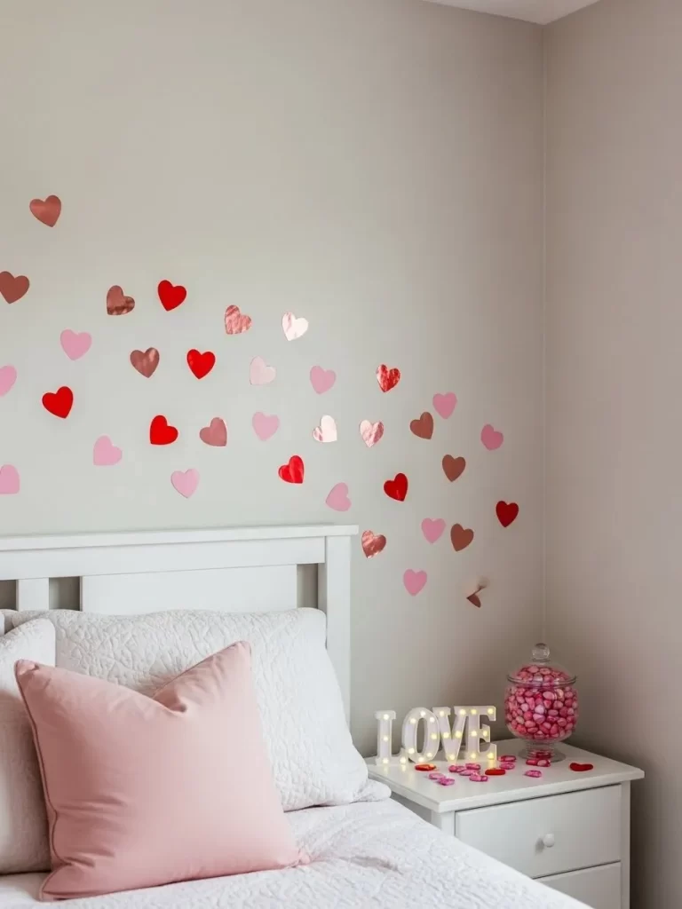 A quick, high-impact swap is essential for temporary holiday decorating, and these vinyl heart decals fit the bill perfectly. Spreading the hearts in a constellation-like pattern above the headboard draws the eye upward, making the room feel festive and lively without being overwhelming. The mix of deep red, pale pink, and metallic rose gold adds a sophisticated glimmer when catching the light.