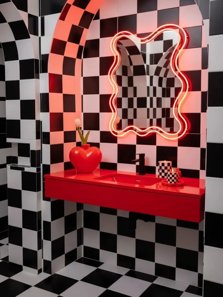 - Install the pink and white checkerboard tiles on your vanity walls.