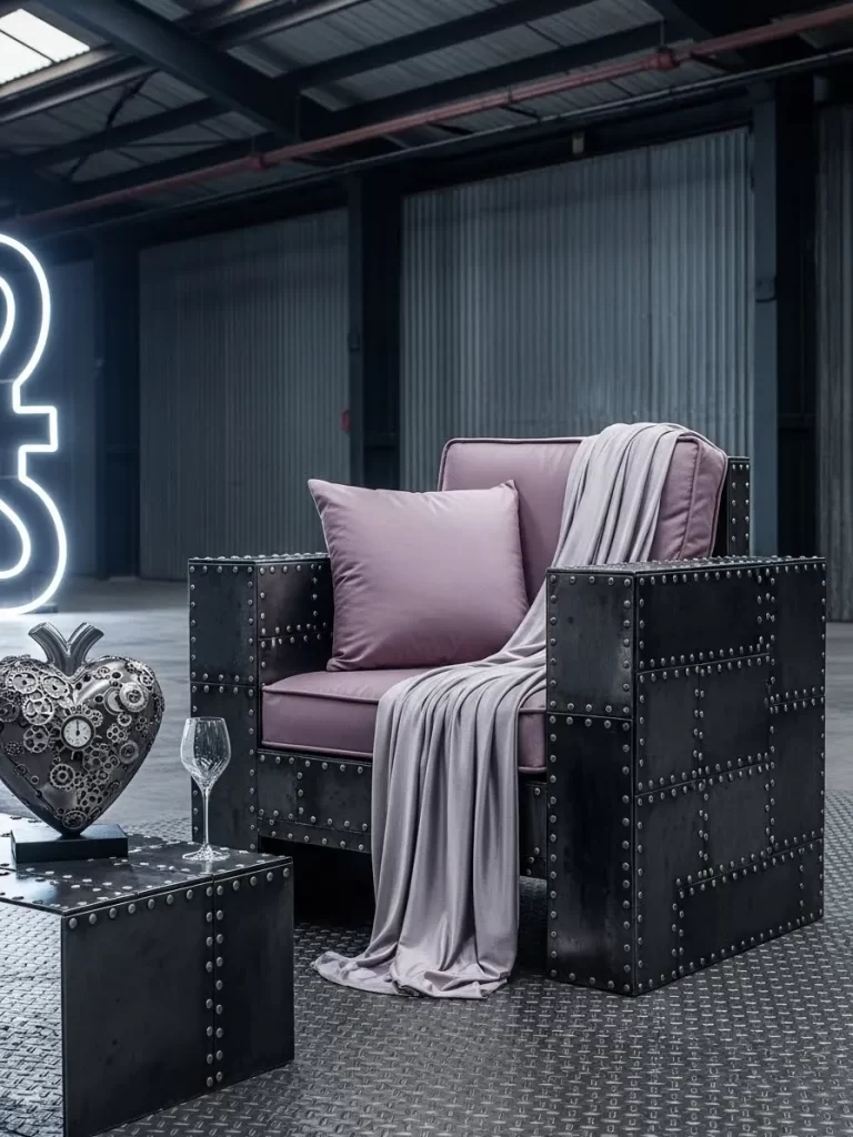 Industrial spaces look stunning when you add soft pink touches. A stone heart with gold veins sits on a concrete table next to a single rose. This vibe mixes tough materials with romantic symbols.