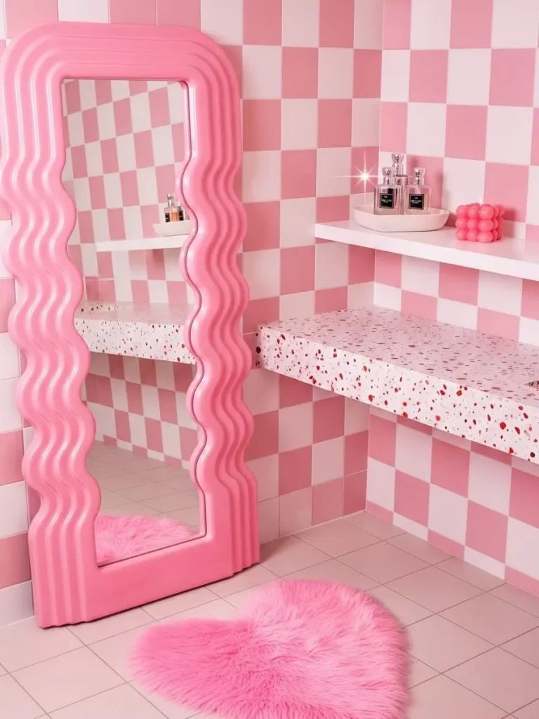 Playful patterns and soft pink tones turn this vanity area into a modern dream. A wavy pink mirror reflects the light from a nearby shelf with perfume bottles. The checkerboard tile walls provide a bold and graphic background for the room.