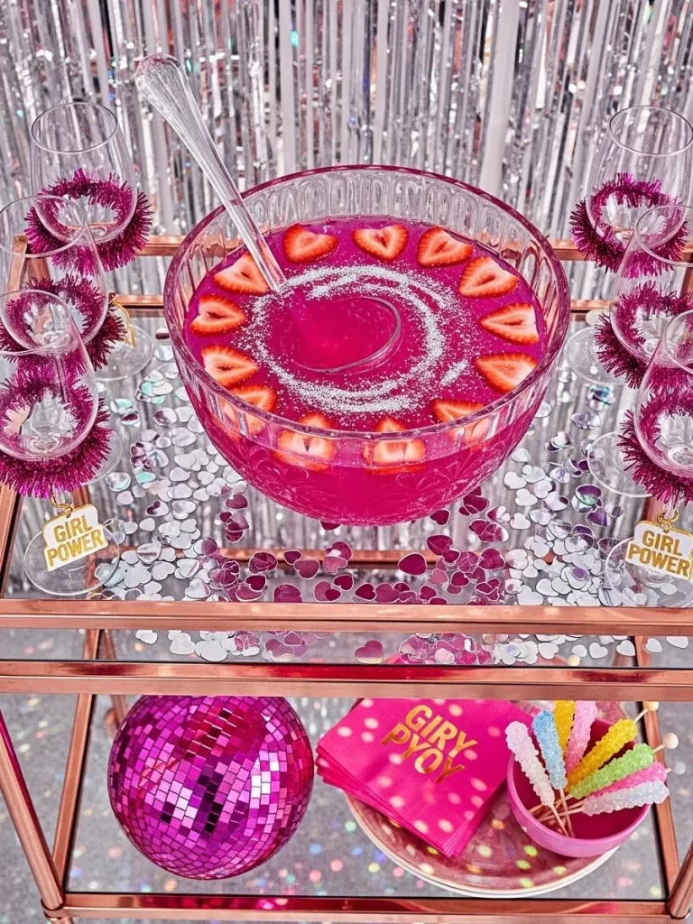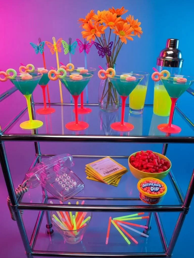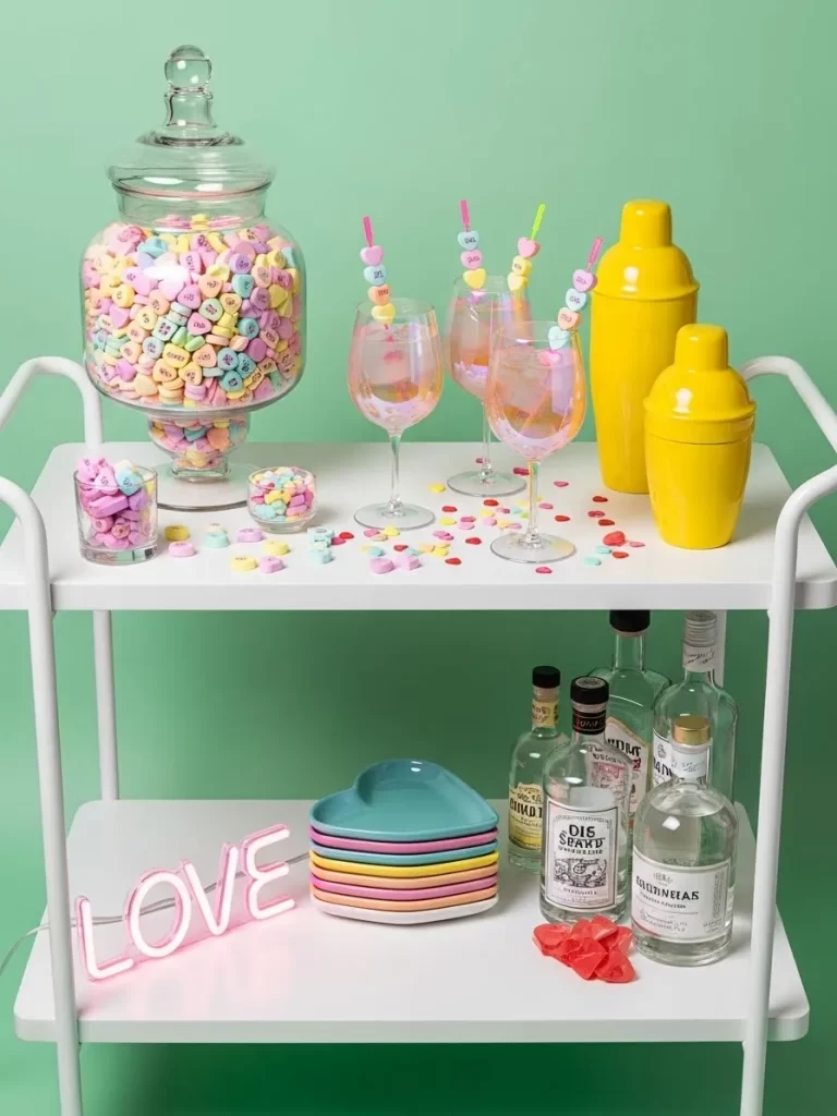 Small bowls of loose candy invite guests to help themselves throughout the evening. Pink neon signs and pastel plates keep the energy light. Yellow shakers add a bold sunny accent to the soft color palette. Heart shaped stir sticks make every drink look festive and ready for a photo.