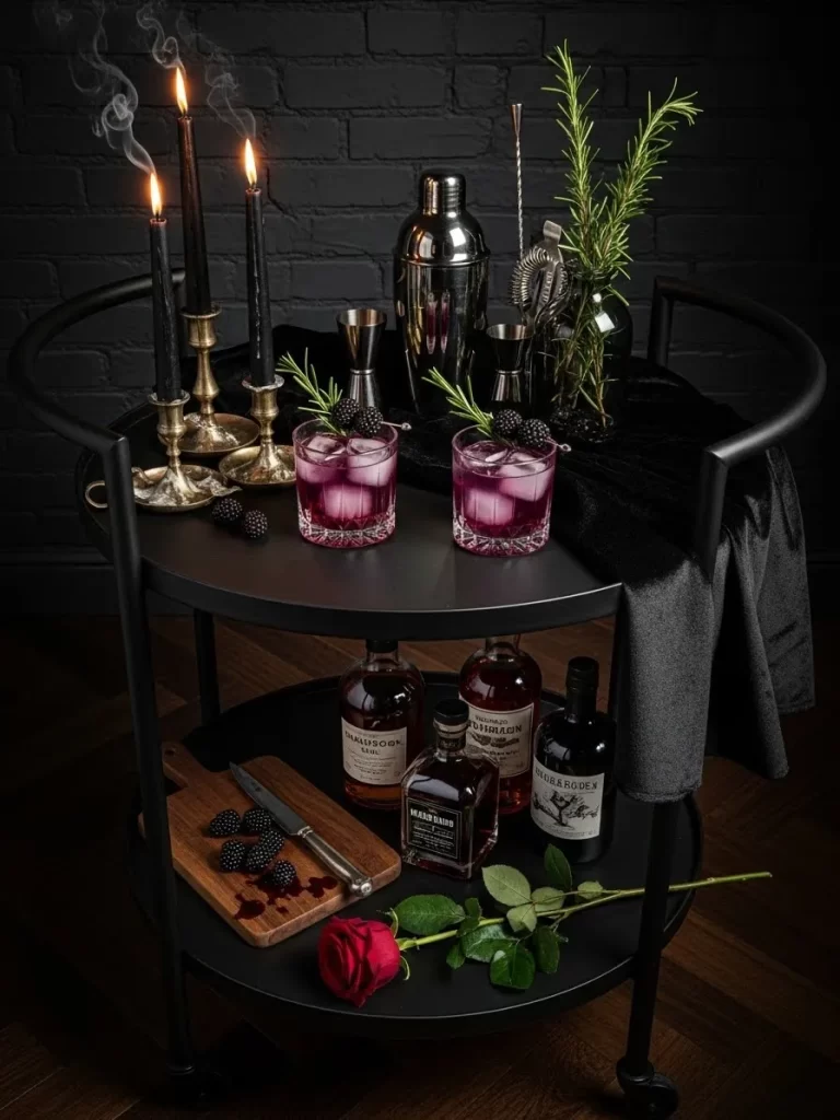 A single red rose lies on the bottom shelf as a classic symbol of affection. Vintage brass candle holders add warmth to the cool black surfaces. Wood cutting boards and dark glass bottles make the station feel grounded. Guests will enjoy the intimate vibe of this unique setup during a late night conversation.
