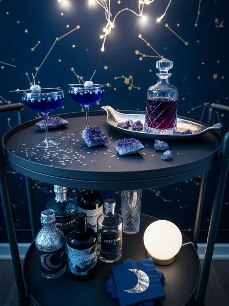 Blue bottles decorated with gold stars keep the celestial theme consistent and bold. A sage bundle and various stones suggest a spiritual and calm hosting environment. This setup is for the host who loves the zodiac and cosmic details for Valentine’s day.