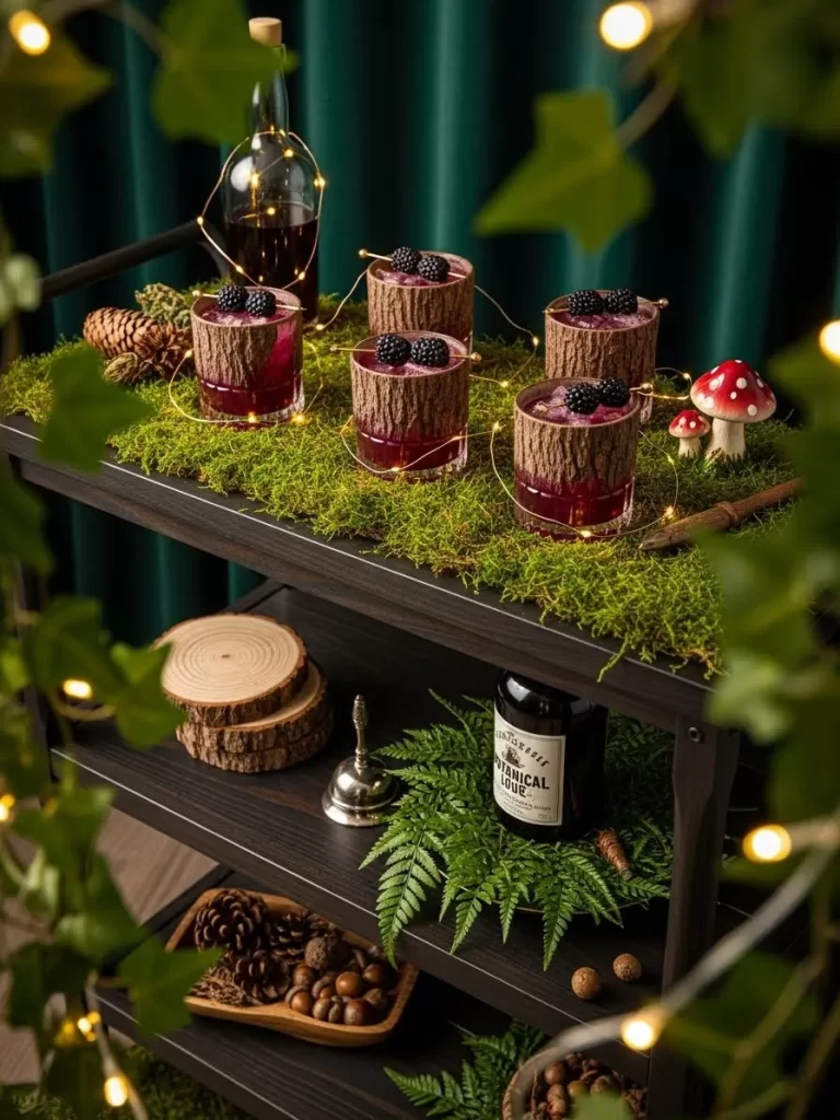 Fairy lights woven through the greenery add a soft and enchanting shimmer to the room. Mushrooms and ferns on the lower shelves suggest a hidden woodland retreat. This setup is for the host who loves nature and a whimsical atmosphere at home.