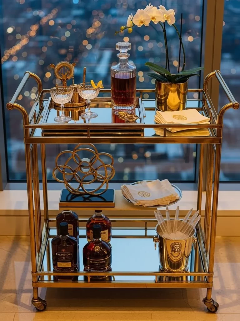 City lights in the background provide a sparkling environment for your holiday party. Symmetry plays a big role in keeping this cart looking organized and expensive. White napkins with gold embroidery sit ready for use on both levels. A gold geometric sculpture on the bottom shelf adds an artistic touch to the glass shelves.