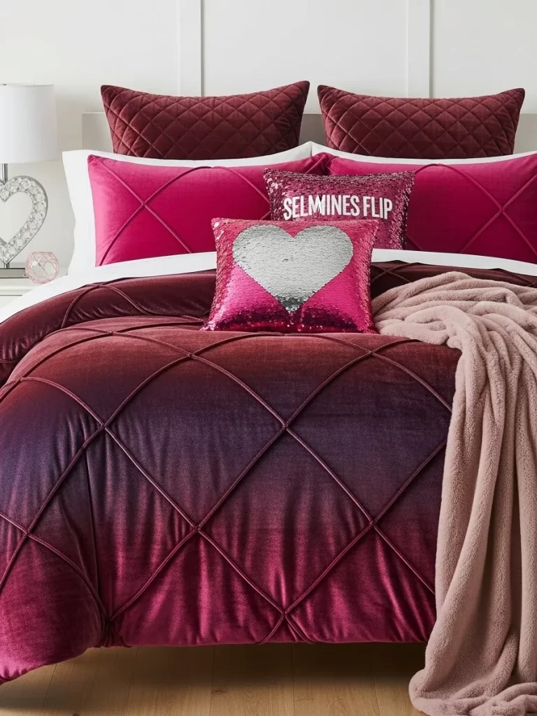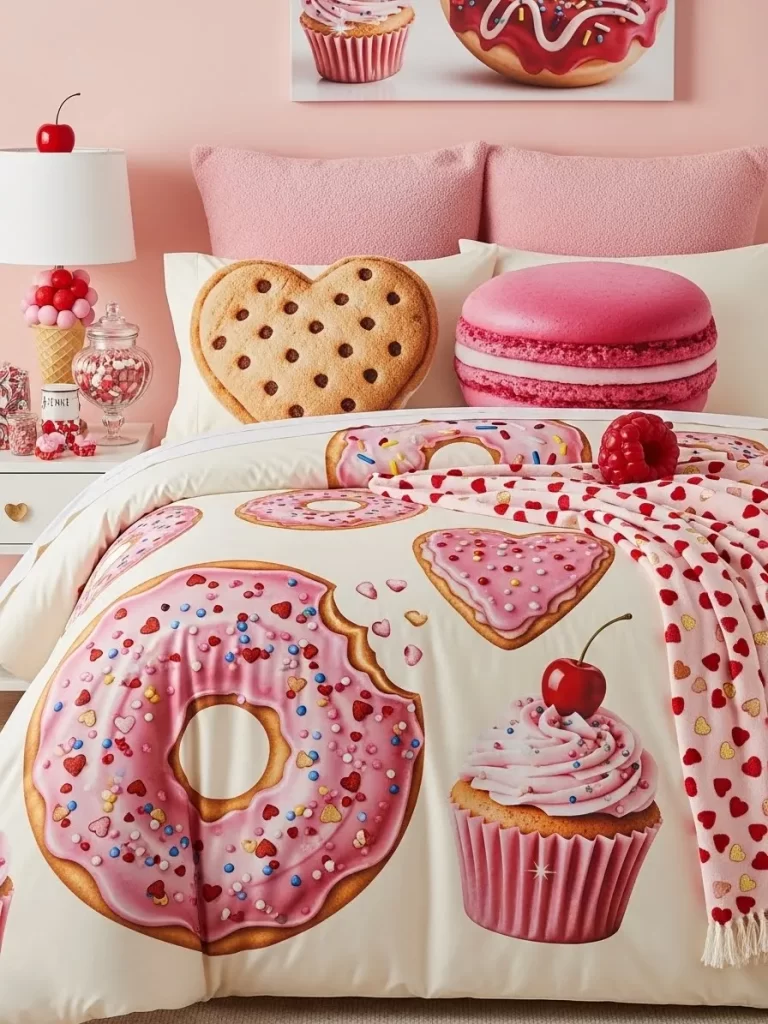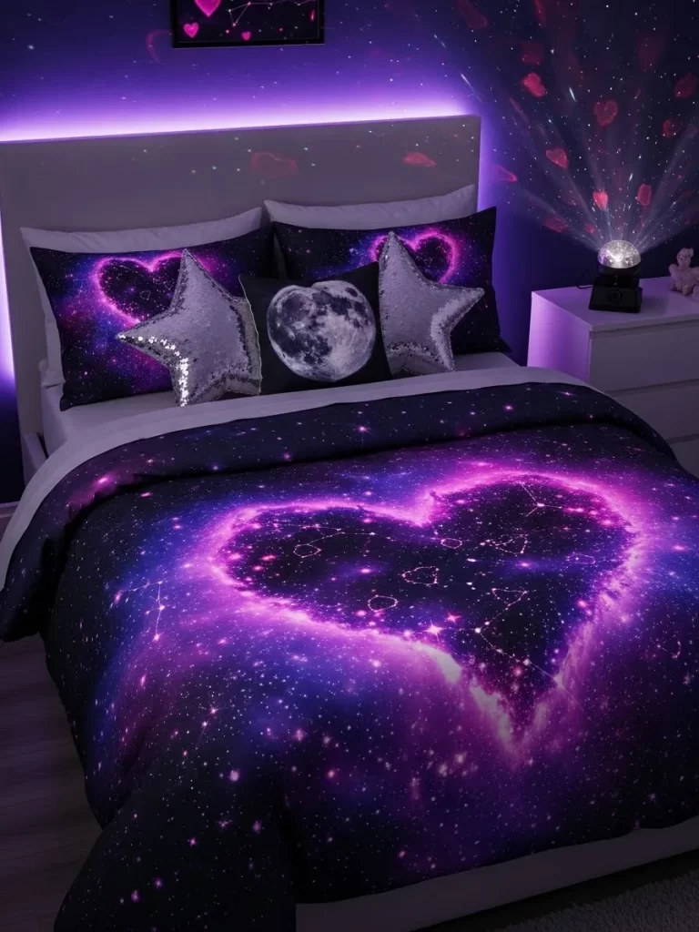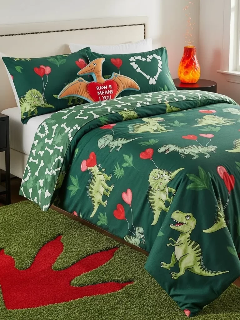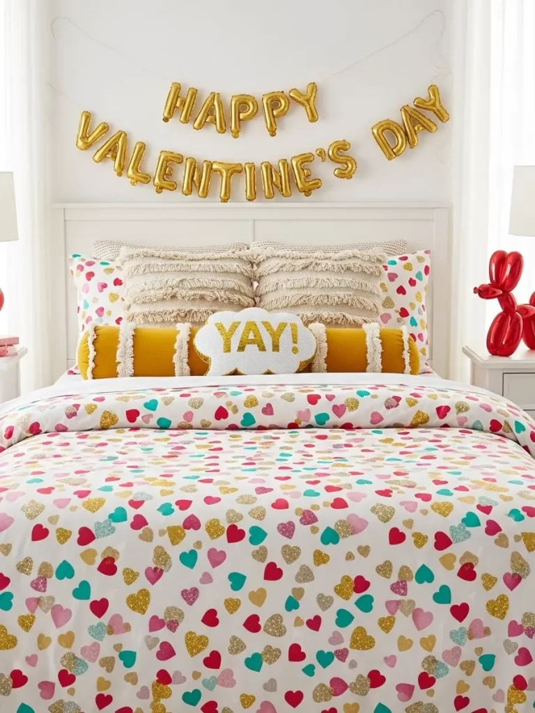 Glowing purple lights behind the headboard make the pixel art look like a screen. Your kid will love seeing the level up messages on their own pillows. This design proves that Valentine’s Day can be cool and modern for everyone. It makes the room feel like an interactive zone for play and rest.