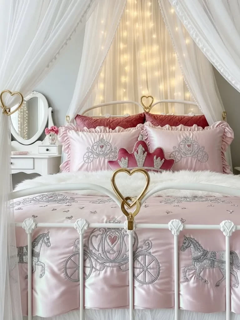 A grand white canopy with sheer curtains turns the bed into a royal throne. A deep red velvet runner features golden embroidery for a very fancy look. The sequin heart pillows and gold framed art add layers of luxury to the space. It is the ultimate design for a child who wants to feel very special.