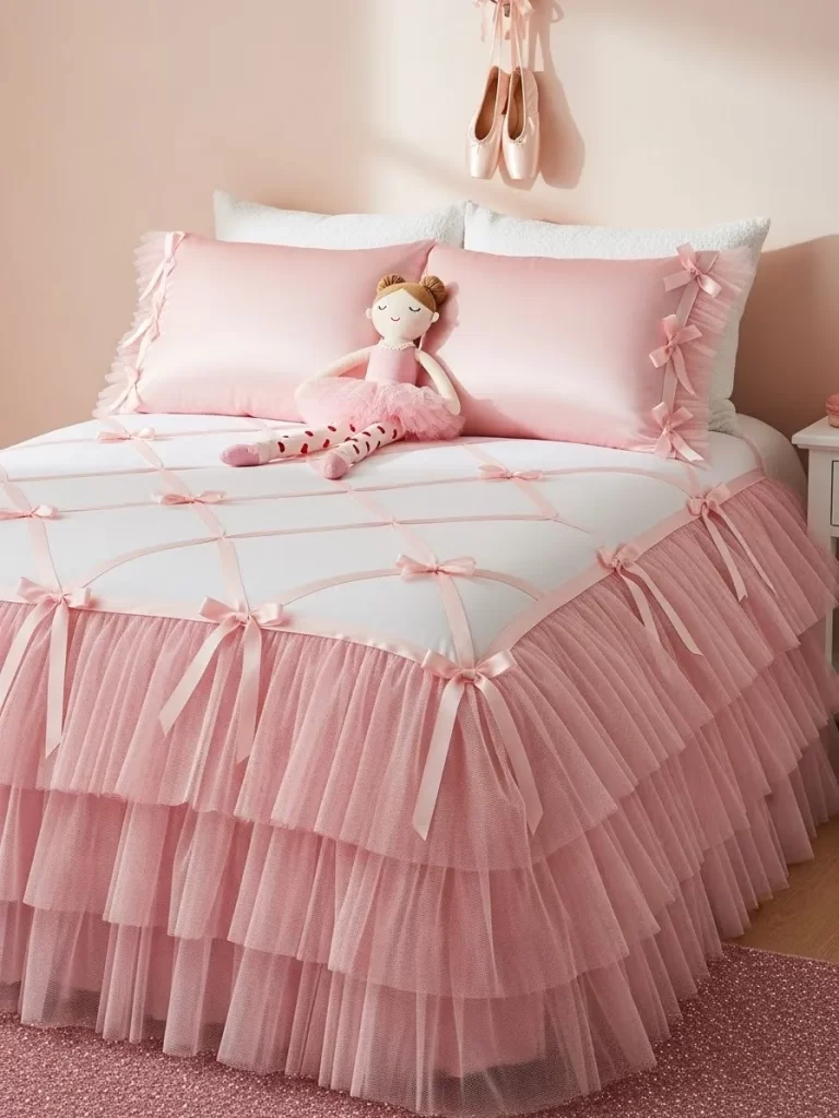 Matching satin ballet slippers hang on the wall to act as beautiful decor pieces. A small ballerina doll sits on the bed to welcome your child at night. The whole space feels like a delicate dream of pink and white. It is a wonderful choice for a child who loves ruffles and soft textures.