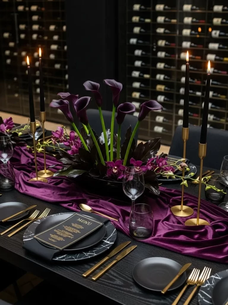 A velvet runner in forest green anchors the scene. This adds a soft layer of elegance to the dark wooden surface. These deep jewel tones create a sophisticated atmosphere. Such a choice moves beyond traditional pinks and bright reds.