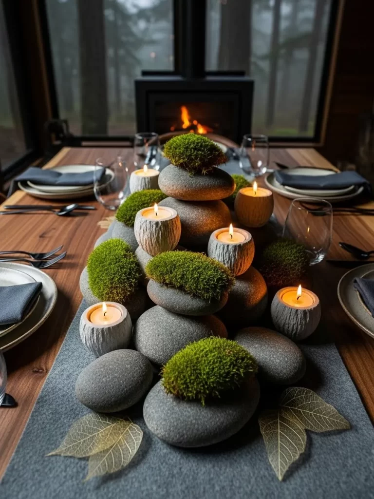 This minimalist look is excellent for a sophisticated apartment dinner for two. The high contrast between the black holders and the bright candles creates a bold focal point. It proves that a few well chosen items can create a very romantic mood.