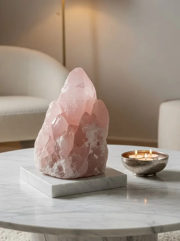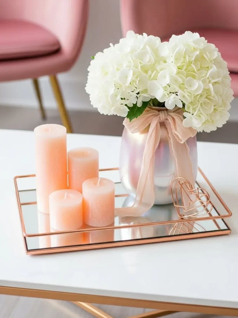 Soft pink hues meet shimmering gold to create a warm atmosphere on your tabletop. Mirror surfaces reflect light and double the visual impact of your decorations. You can easily elevate a plain surface by layering textures and colors. This setup brings immediate charm to any room.
