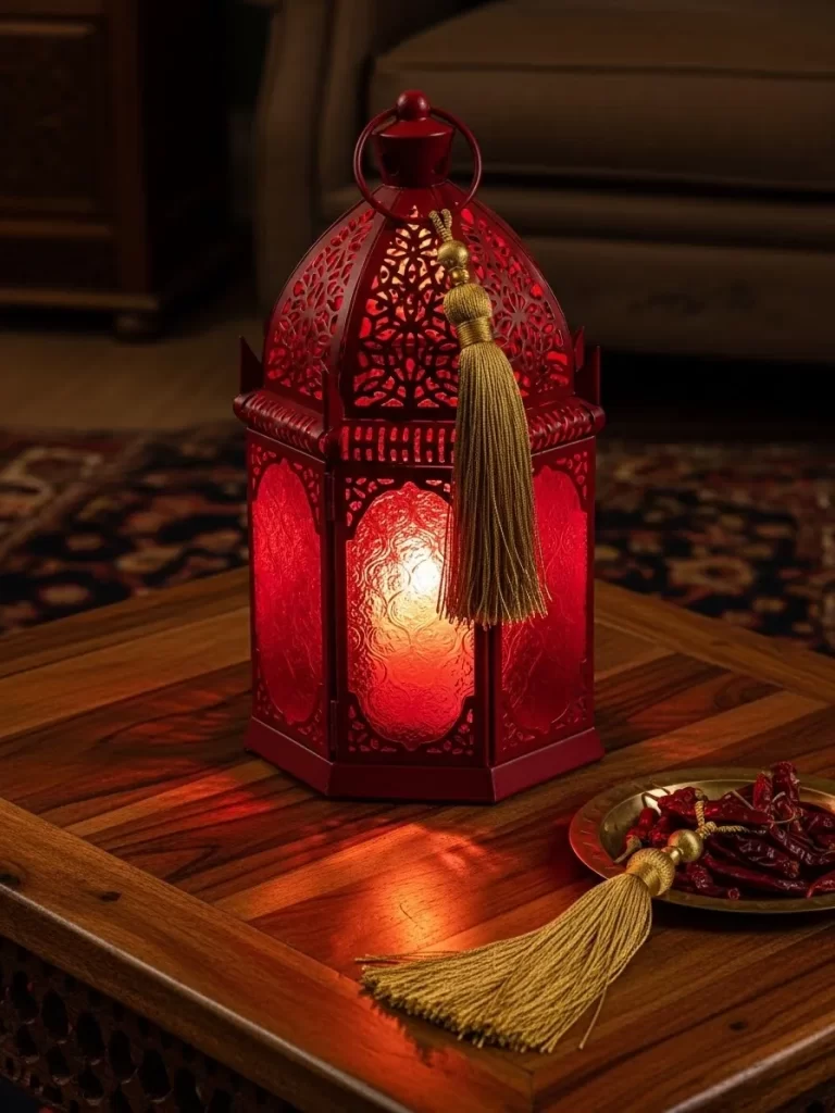 Exotic patterns and warm light create a cozy and adventurous mood for your home. A deep red metal lantern with intricate cutouts glows with a soft internal flame. Gold tassels and dried peppers add a spicy and unique touch to the wooden table. You will feel like you are in a faraway land during your evening at home.