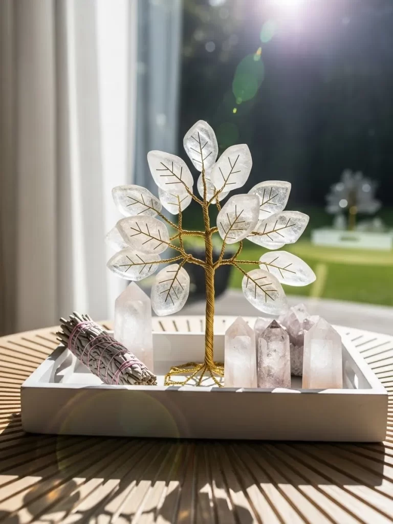 A bundle of dried sage tied with pink string adds a soft organic scent nearby. The bright sunlight from a window makes the crystals glow with a pure white light. This setup is for someone who loves spiritual decor and the beauty of minerals. It brings a sense of peace and clarity to your living room.