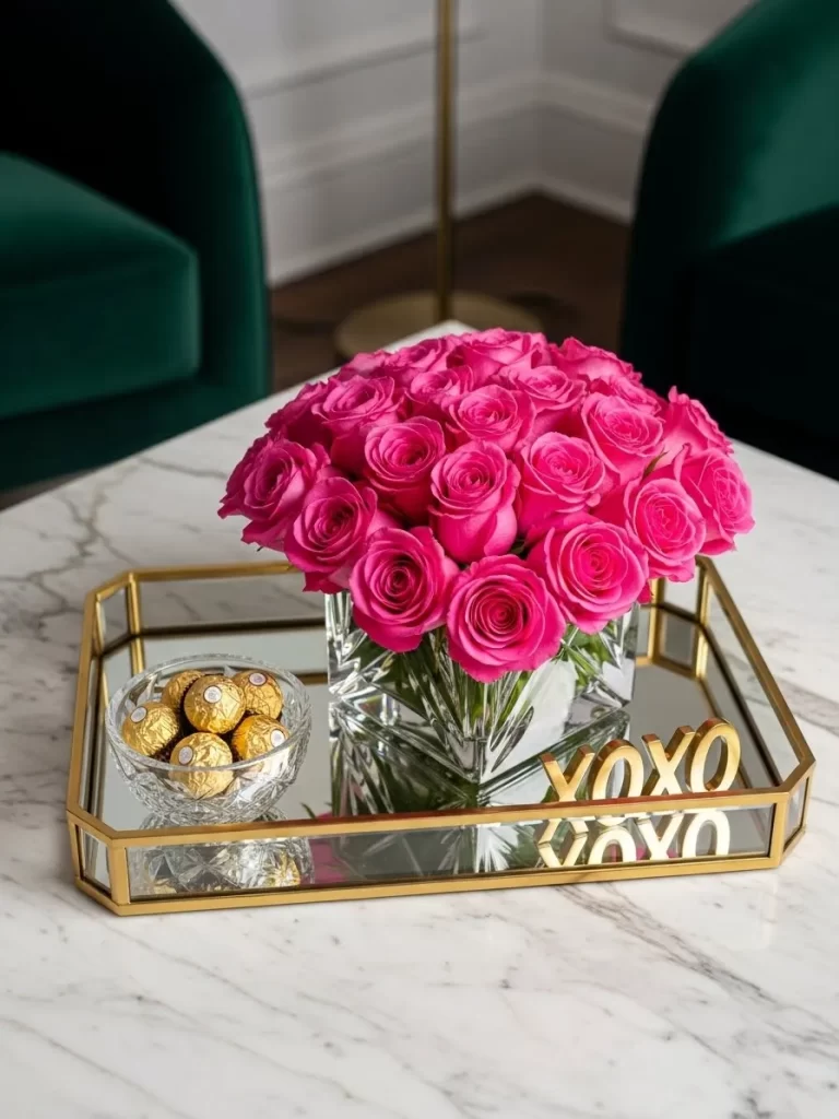 Bright pink roses provide a classic and vibrant energy to your tabletop. A square glass vase keeps the focus entirely on the lush flower petals. Gold accents on the tray add a touch of luxury to the overall presentation. You will find that this setup brightens the entire room instantly.