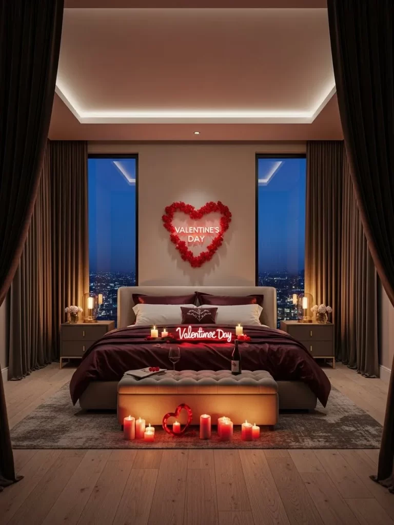 Neon light breathes life into a cold bedroom wall. A vibrant red rose heart frame anchors the space above the bed. This setup creates a soft radiance that makes the entire room feel like a warm hug.