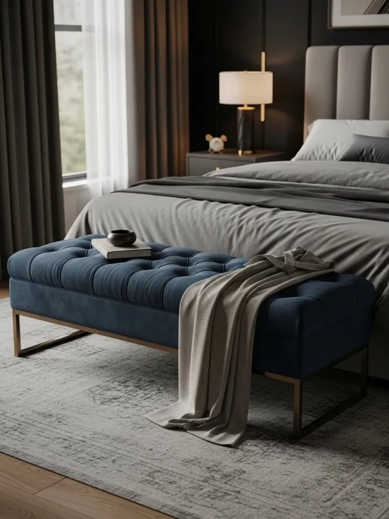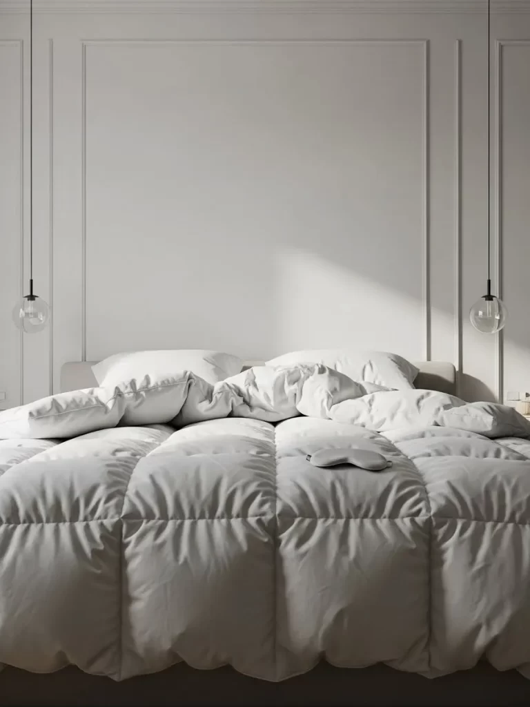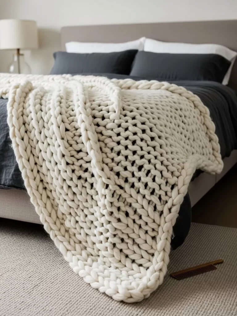- Drape a grey blanket over the foot of the bed to complete the scene.