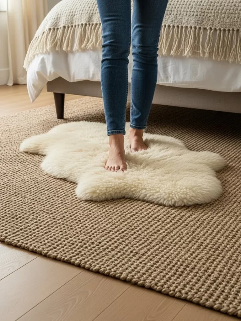 - Place the white sheepskin rug directly on the floor where the light hits.