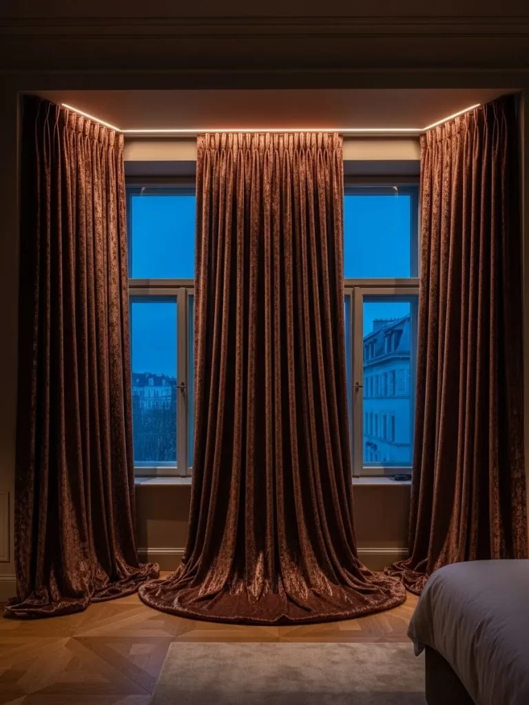 Heavy fabric is a great way to trap heat in a chilly room. These thick velvet curtains puddle on the floor for a rich look. A hidden light strip at the top creates a beautiful halo effect across the fabric.