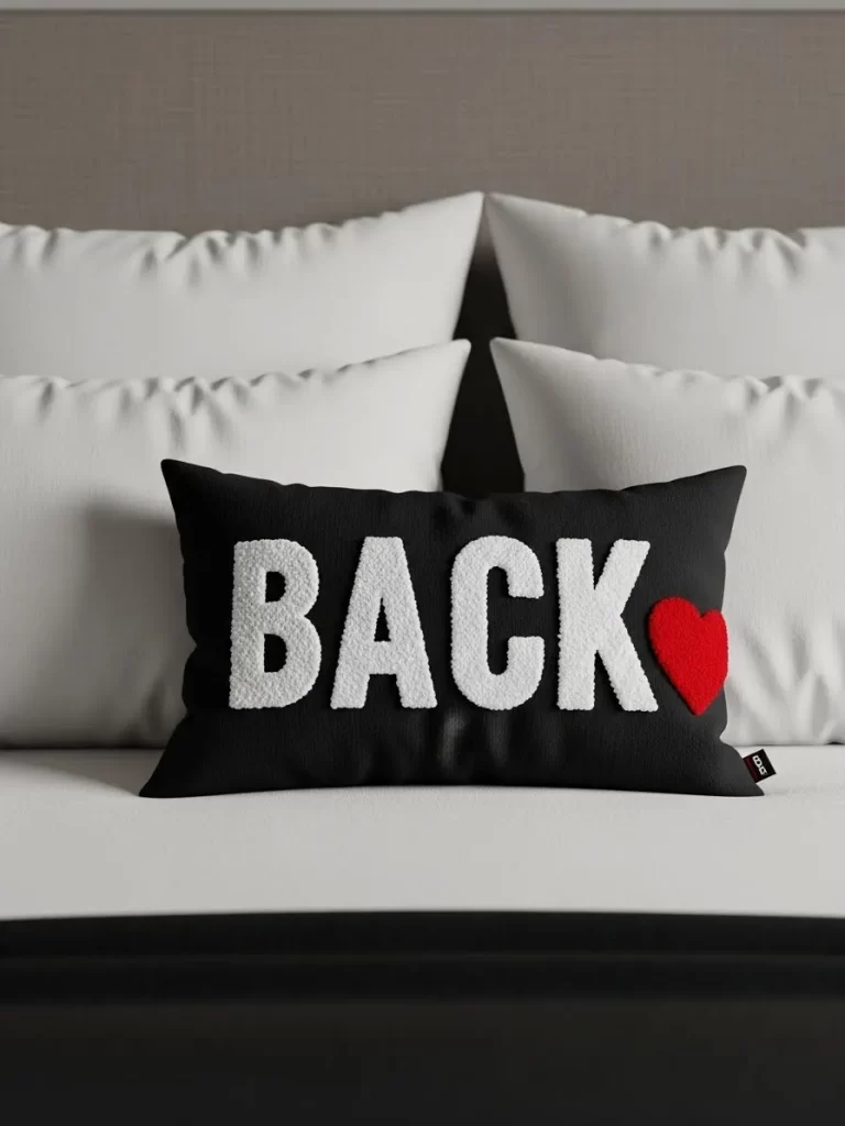 Make a bold statement with a graphic pillow that shows some love. This black cushion features high contrast white lettering and a bright red heart. It adds a playful and modern touch to a traditional bed setup.