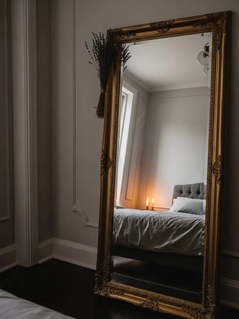 Add a touch of vintage drama with a large mirror in a heavy gold frame. This piece leans against the wall to reflect the entire bed and soft candlelight. The intricate carvings on the frame make it a stunning focal point.