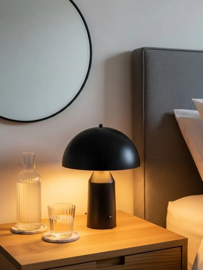 Warm light spills downward to illuminate your favorite book or a glass of water. The simple design keeps your nightstand looking tidy and organized. It creates a peaceful spot for your evening routine.