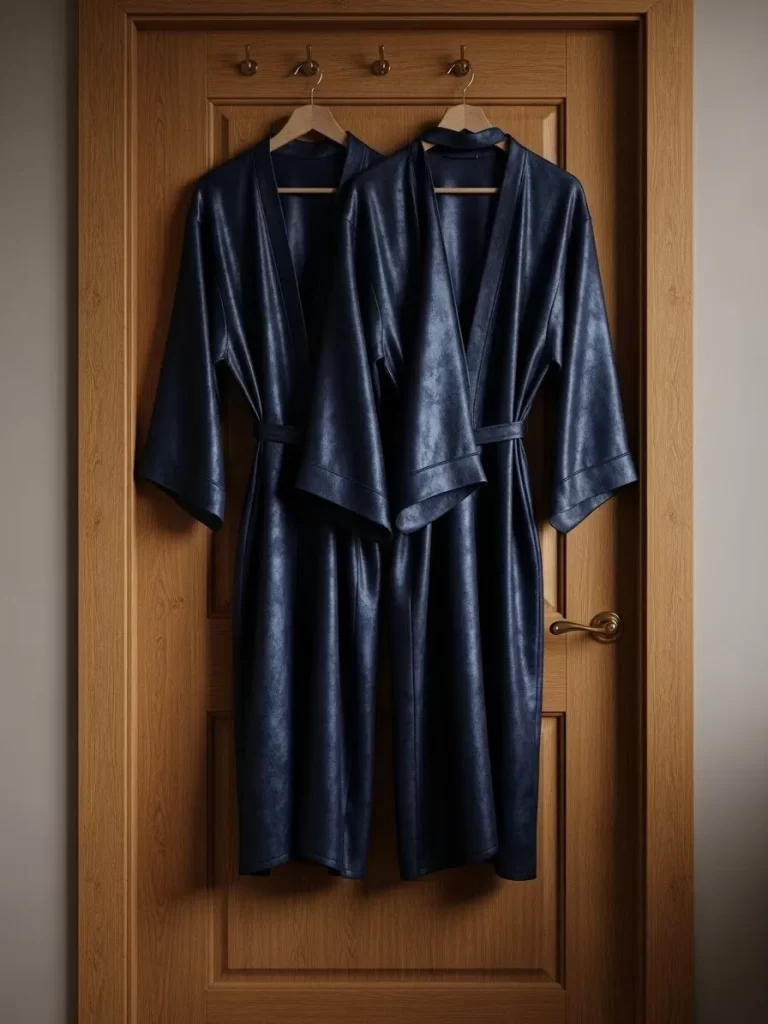 Hanging a pair of luxurious robes on your bedroom door adds a sense of hotel style pampering. These deep navy silk garments feature a subtle shimmer that catches the light beautifully. Such a simple addition encourages you to slow down and enjoy a relaxed morning together.