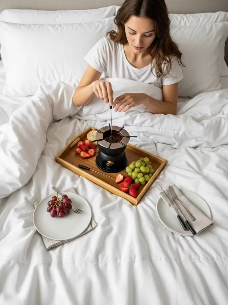 Everything you need stays right at your fingertips so you do not have to leave the bed. Melted chocolate provides a rich aroma that fills the air. It is a fun and interactive way to spend an evening together.