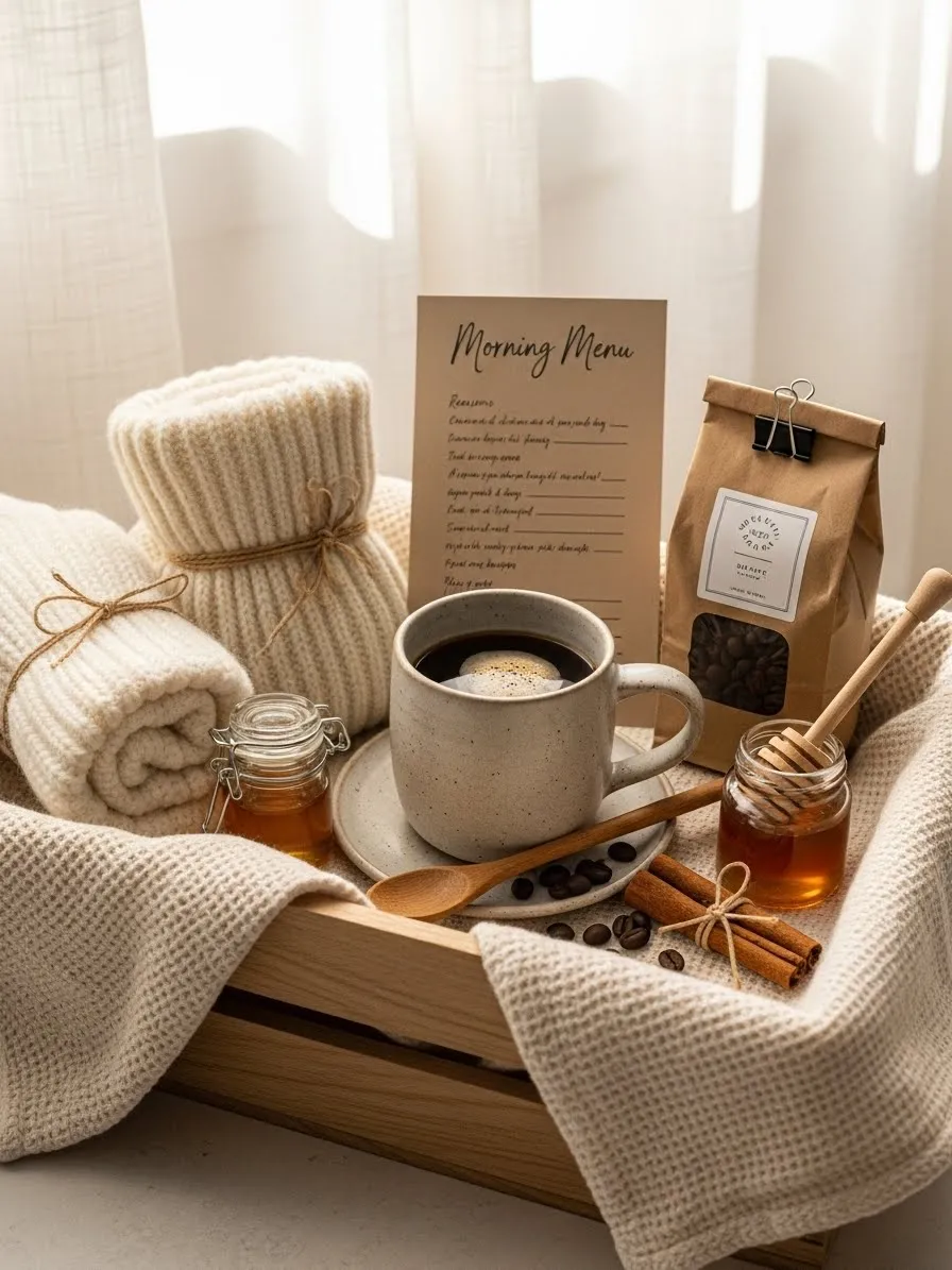 Notice the soft cream socks paired with rich coffee beans and sweet honey. Cinnamon sticks add a spicy aroma that fills the room instantly. A printed morning menu brings a personal touch to this thoughtful assembly.
