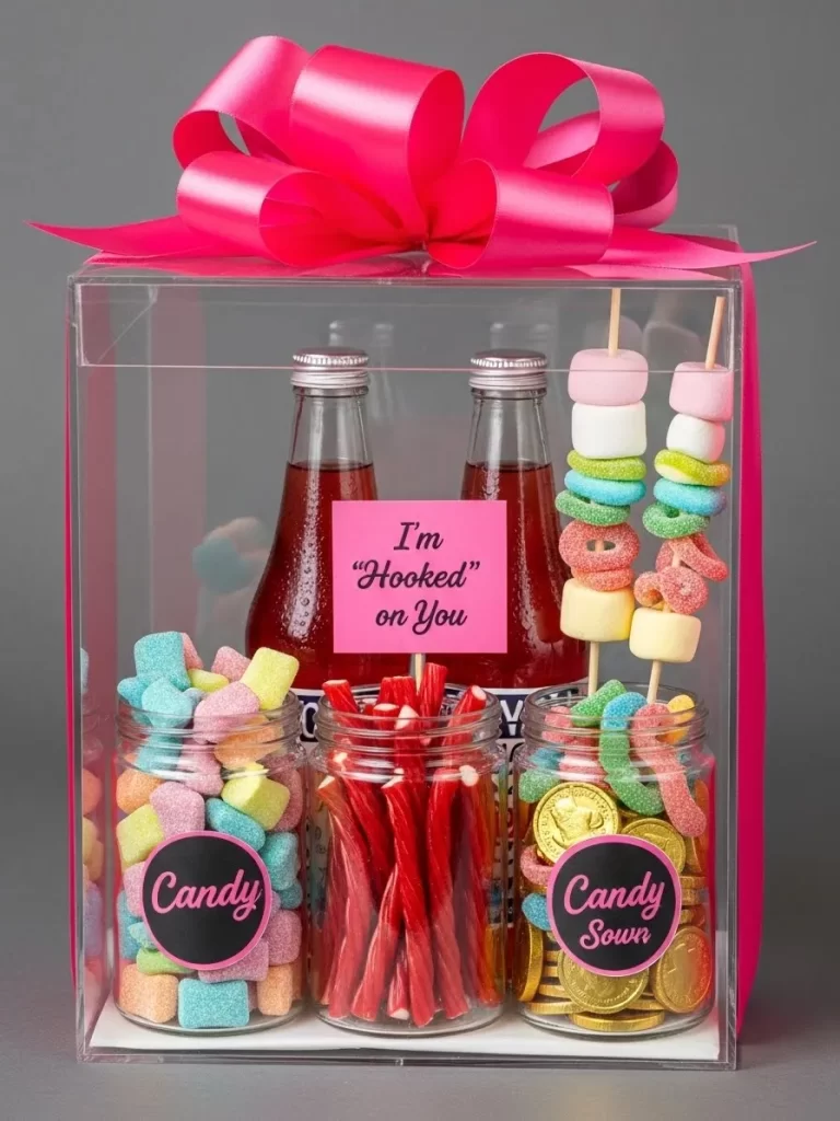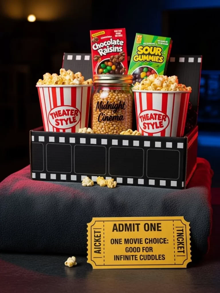 Movie nights bring couples closer without spending much money. This box holds everything for a private screening at home. Popcorn stays fresh in striped buckets while candy adds a sweet crunch.