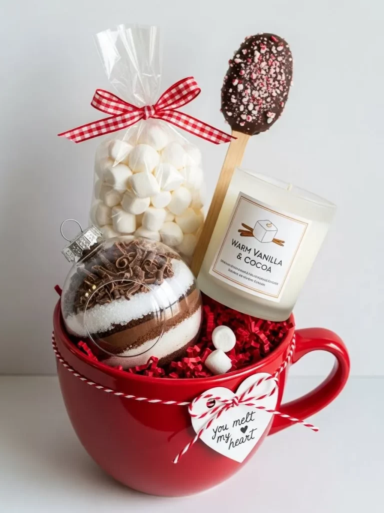 Soft marshmallows wait in a bag tied with a checkered ribbon. A chocolate dipped spoon promises extra richness with every single stir. Scented candles set the mood for a relaxing night in.