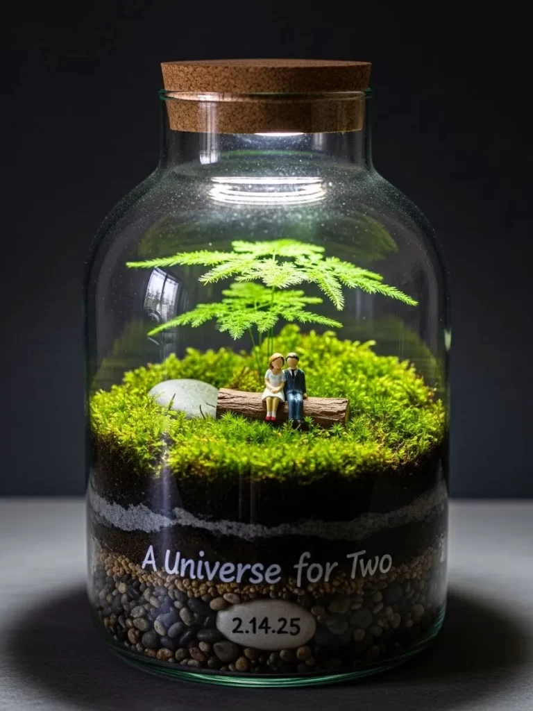 Creating a world in a jar is a magical and rewarding project. This glass terrarium contains a miniature forest of green moss. A tiny couple sits on a log under a canopy of delicate fern.