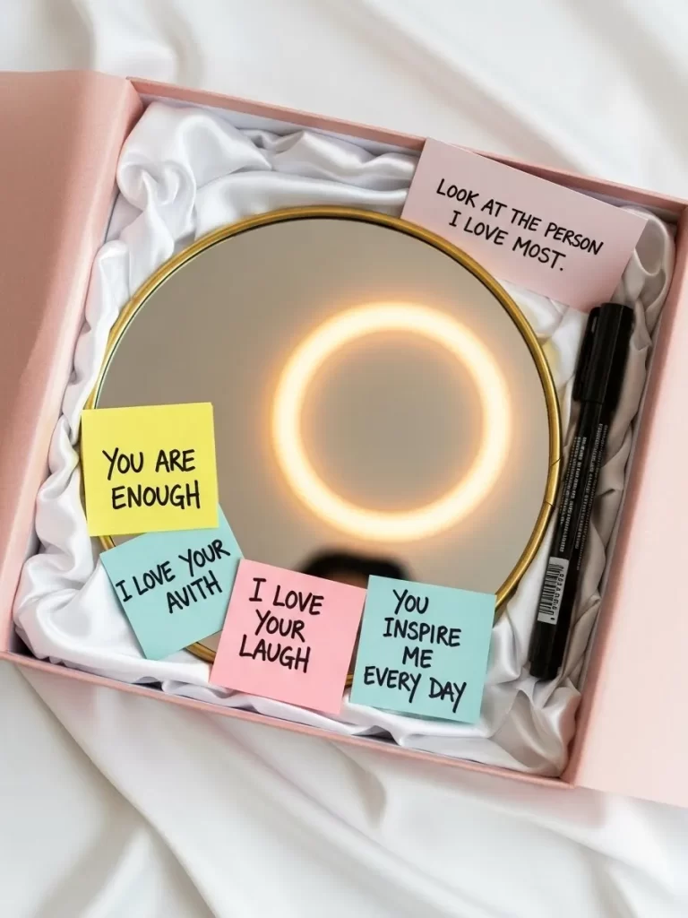 Self love is the most important foundation for any healthy relationship. This pink box holds a round mirror surrounded by soft white fabric. Bright sticky notes offer words of encouragement and deep kindness.