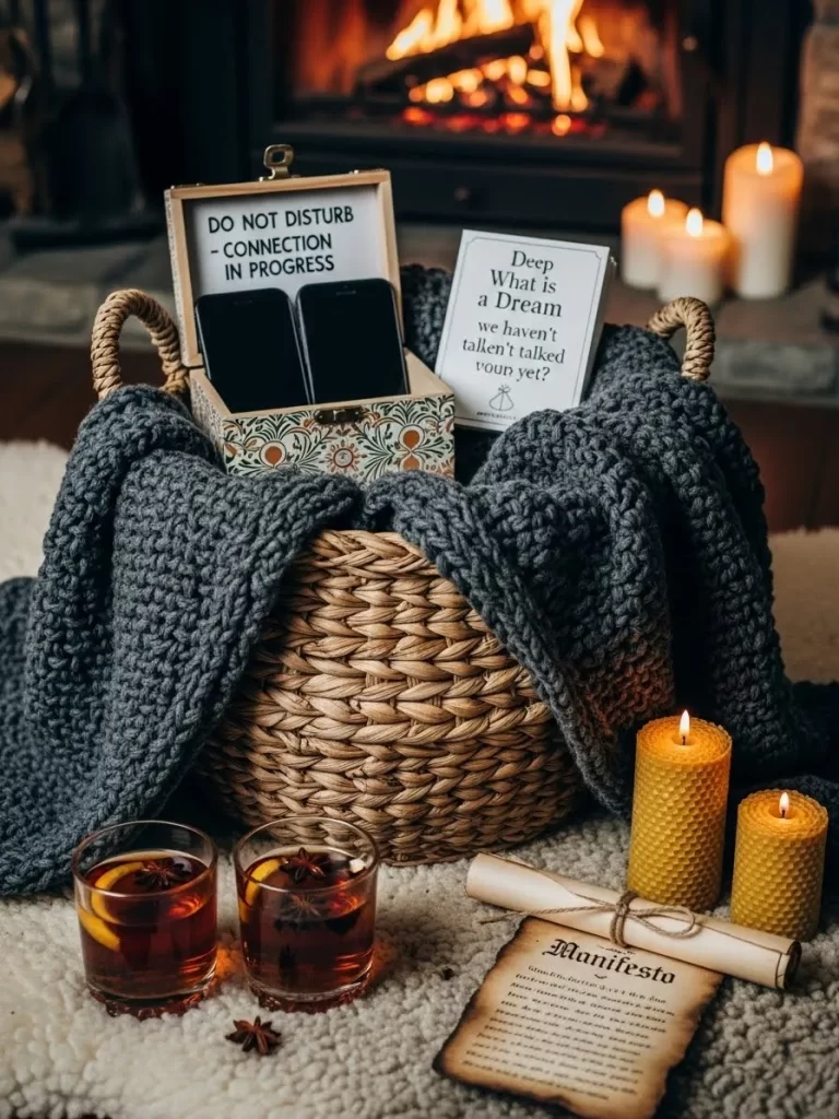 Warm cider and a thick knit blanket set the stage for a fire. A manifesto and prompt cards help you explore new topics together. This gift is an investment in the quality of your time spent.