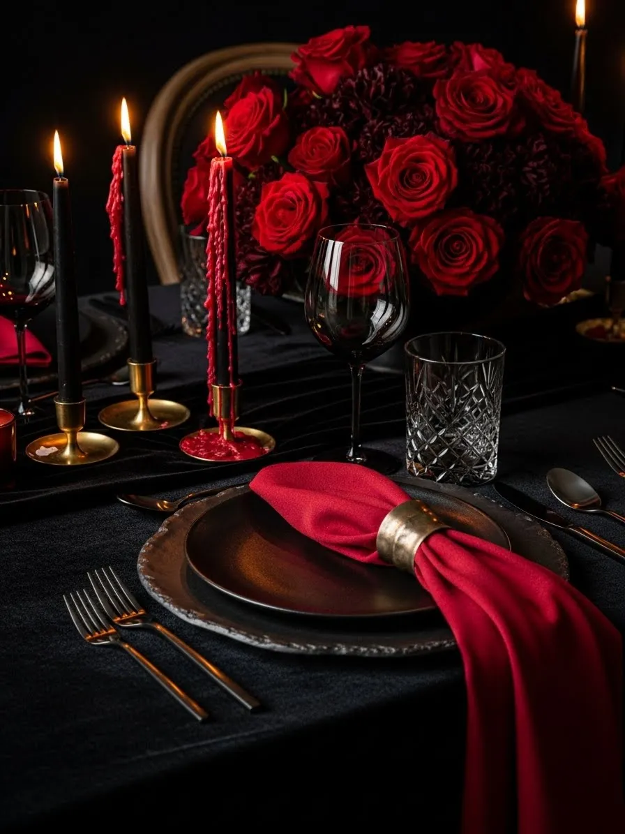 Darkness meets passion in this striking table arrangement. A deep black tablecloth creates a bold foundation for the vibrant red accents. The centerpiece overflows with lush red roses that draw the eye immediately. Gold candle holders provide a warm glow and a touch of metallic luxury. Red wax dripping down black candles adds a dramatic flair to the romantic evening. This setup feels heavy with mystery and allure.