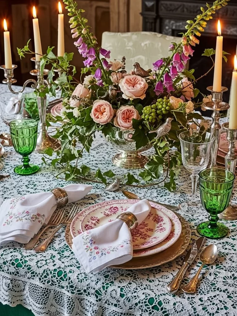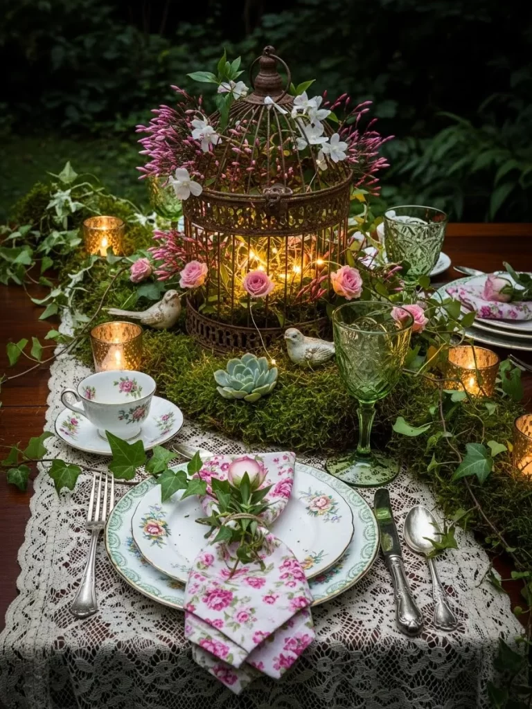 - Set the floral plates and tea cups at each seat. Put a small bird statue near the glass.