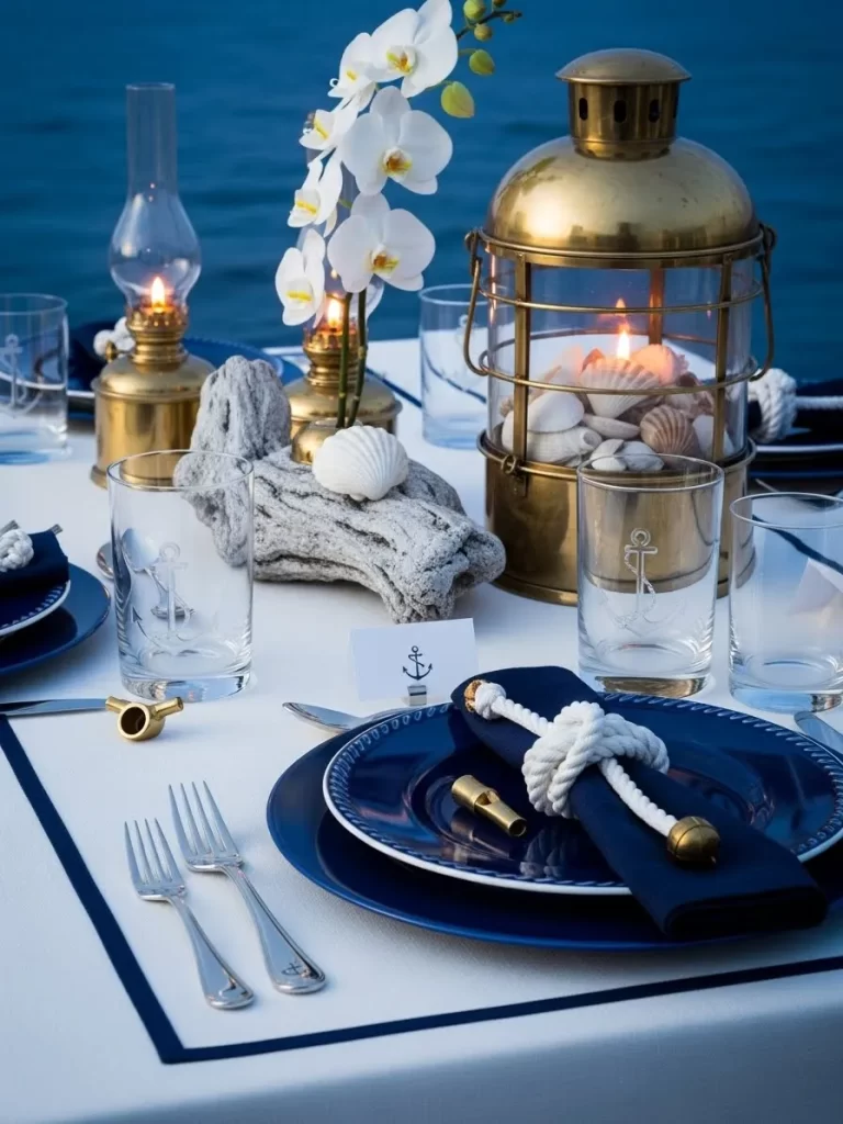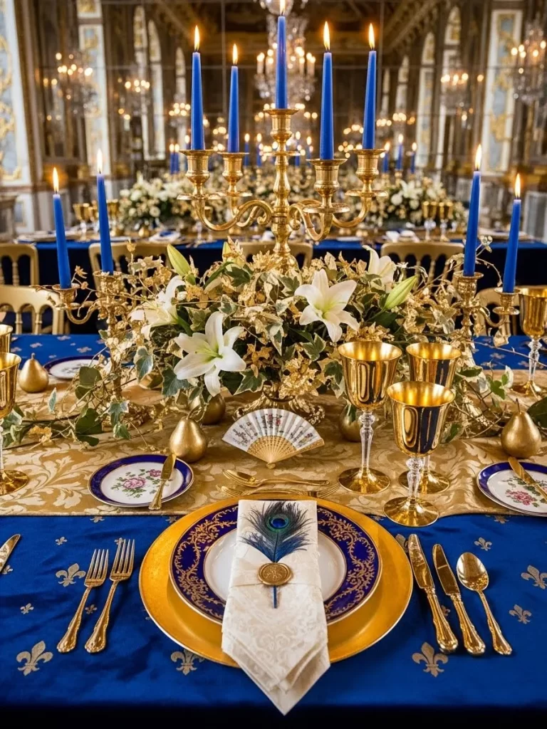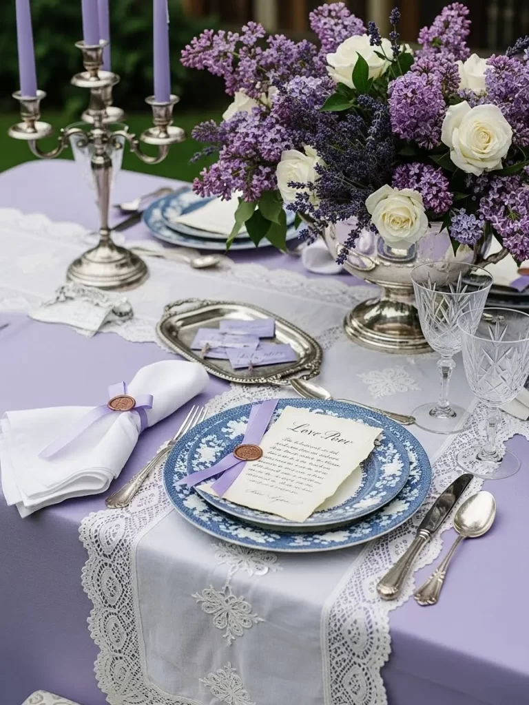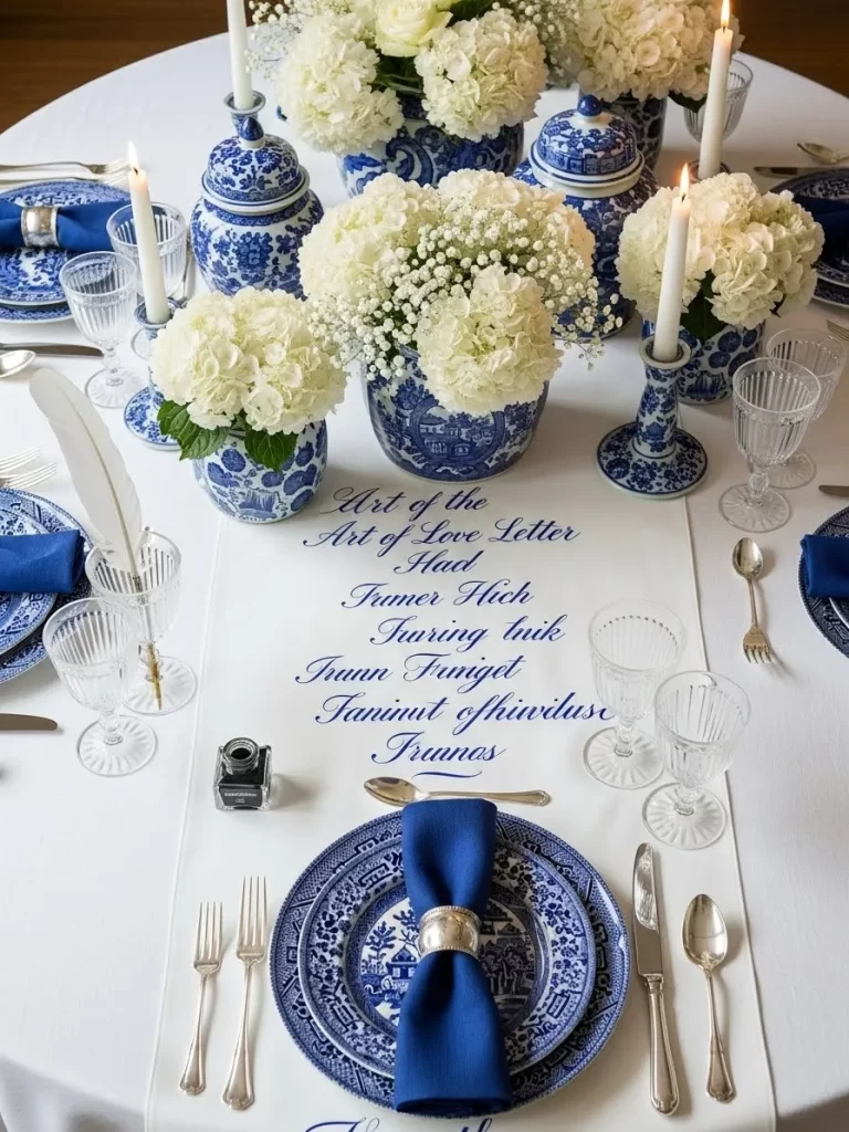 Classic blue and white patterns create a smart and clean look. A white runner features beautiful blue calligraphy writing. Large blue and white vases hold bunches of white flowers. Navy napkins are held by silver rings on matching plates. Ink bottles and feathers are used to decorate the table. This style is excellent for a lover of history and writing.