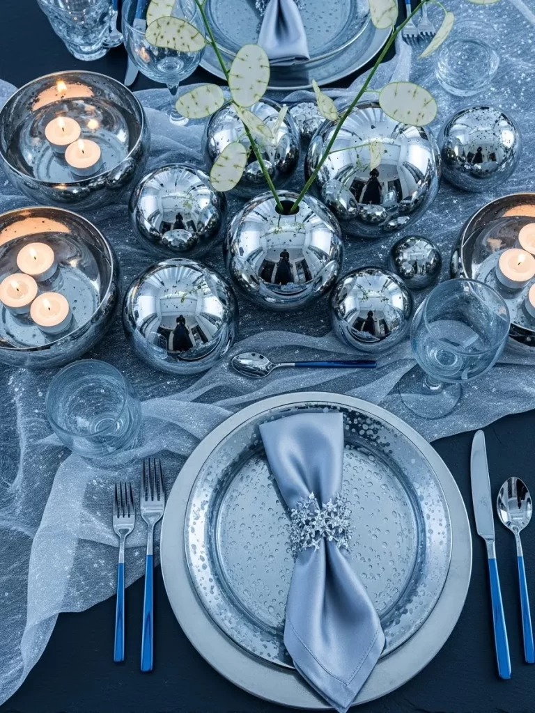 - Fold the silver napkins and place them under the star dishes. Scatter crystals around the base.